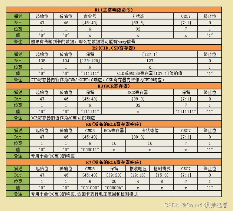 短响应是48bit,长响应是136bit。只有R2类型是长响应。除了R3类型之外,其他响应都使用CRC7校验(R2类型是使用CID和CSD寄存器的内部CRC7)。