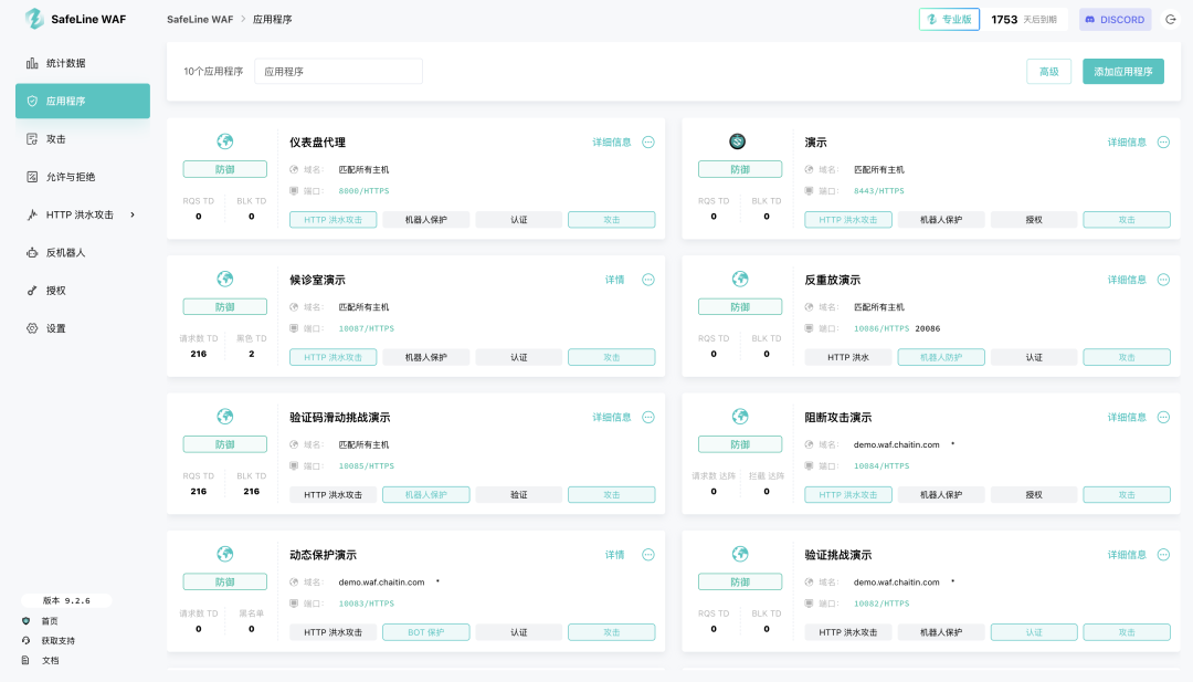 你可以在应用程序这里配置你网站的域名、端口等信息,让 SafeLine 开始防护。