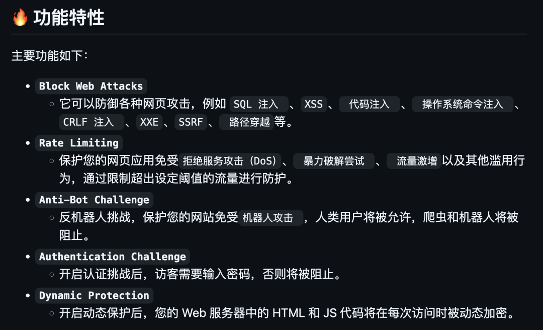 它的核心特性主要是下面这些,能防护绝大多数网站攻击: