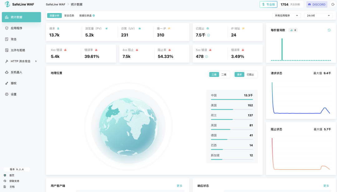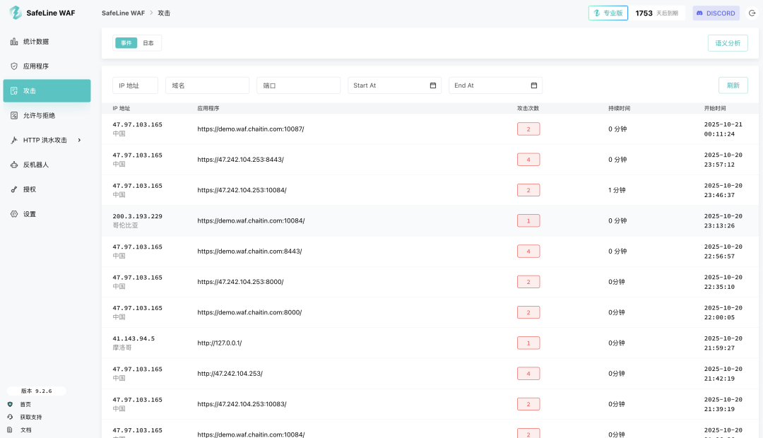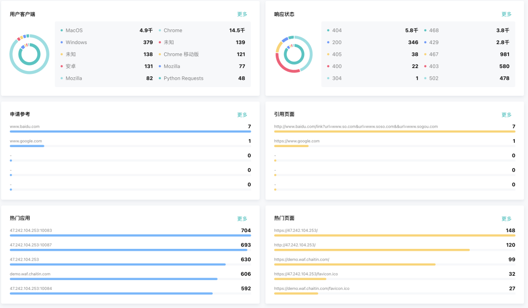 链接:https://demo.waf.chaitin.com:9443/在这个面板,你能直观的看到世界各地对你网站发起的请求。拦截了多少恶意请求、用户的请求客户端、引用页面一目了然。
