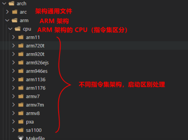 arch:各种架构的启动初始化流程代码,链接脚本等均在此目录对应的架构中存放;