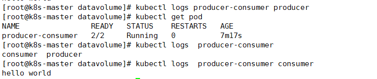 kubectl logs 显示容器consumer 成功读到了 producer 写入的数据,验证两个容器共享emptydir volume