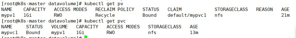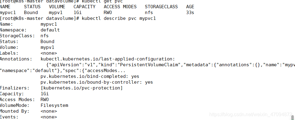 从kubectl get pvc和kubectl get PV的输出可以看到mypvc1已经bound到mypv1,申请成功。
