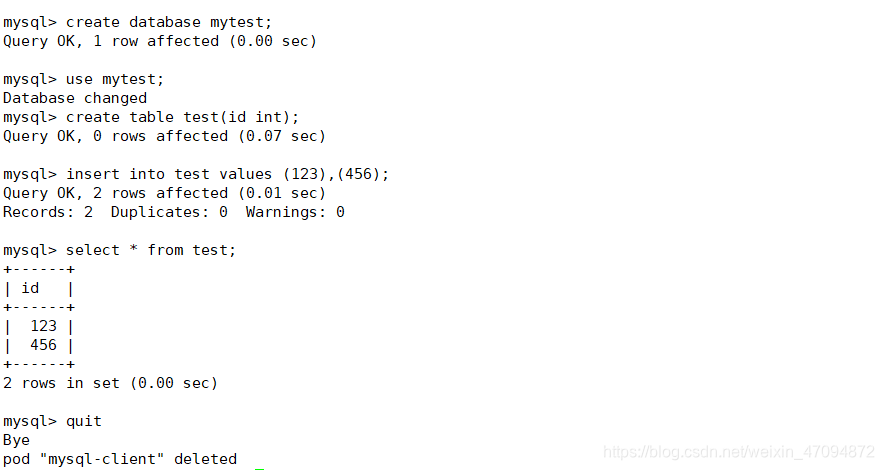 kubectl run -it --rm --image=mysql:5.7 --restart=Never mysql-client -- mysql -h mysql -ppassword