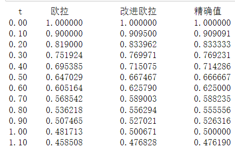 print(" t\t 欧拉\t\t改进欧拉\t精确值")