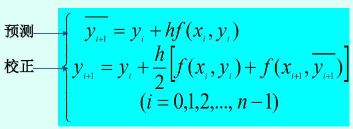 这就是改进的欧拉方法,也称为预测-矫正欧拉法。即先利用显式欧拉公式预测下一个值,再将下一个值导入隐式欧拉公式进行纠正,其误差减小,精度提高。