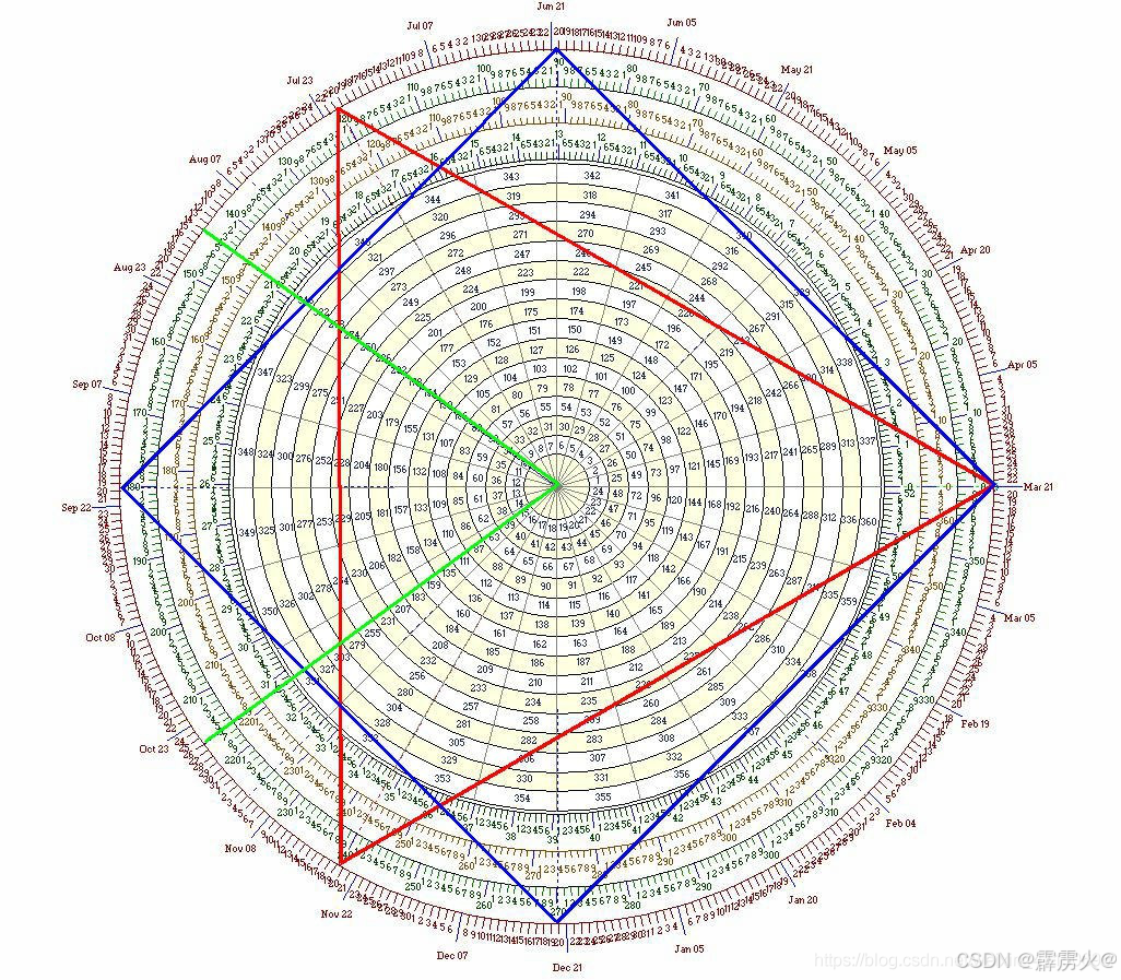 轮中轮出于数理一统的思想考虑,试图兼容360度,365天,12个月,52这个神秘数字(527=364),正方、三角表达圆的方法,在正方轮中还隐含了一个72这个神秘数字,这是为了解决平方循环。(在股市拟合应用的时候,有时候是72*2=144,这与斐氏循环的144个交易日无关,它是指144个自然日。以前,因不懂数学原理,有的书中将其混淆。)。