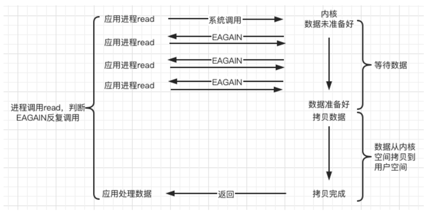 1)当⽤户进程发出 read 操作时,如果 kernel 中的数据还没有准备好,它并不会 block ⽤户进程,⽽是⽴刻返回⼀个 error;
