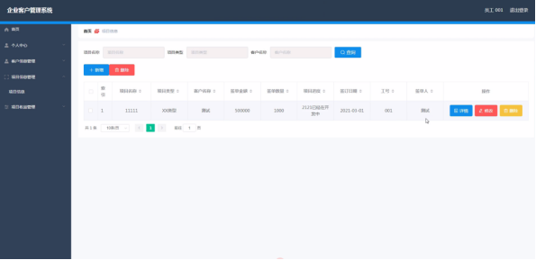 项目信息管理,在项目信息管理页面中可以填写项目名称、项目类型、客户名称、签单金额、签单数量、项目进度、签订日期、工号、签单人等内容,并且根据需要对已有项目信息管理进行详情、收益分配、修改或删除等操作,如图所示。