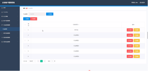 行业类型管理,在行业类型管理页面中可以填写行业类型等内容,并可根据需要对已有行业类型管理进行修改或删除等操作,如图所示。