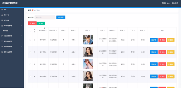 客户信息管理,在客户信息管理页面中通过填写客户名称、行业类型、性别、年龄、照片、手机、身份证、备注、工号、姓名等信息内容,并且根据需要对已有客户信息管理进行详情、修改、删除等其他详细操作,如图所示。