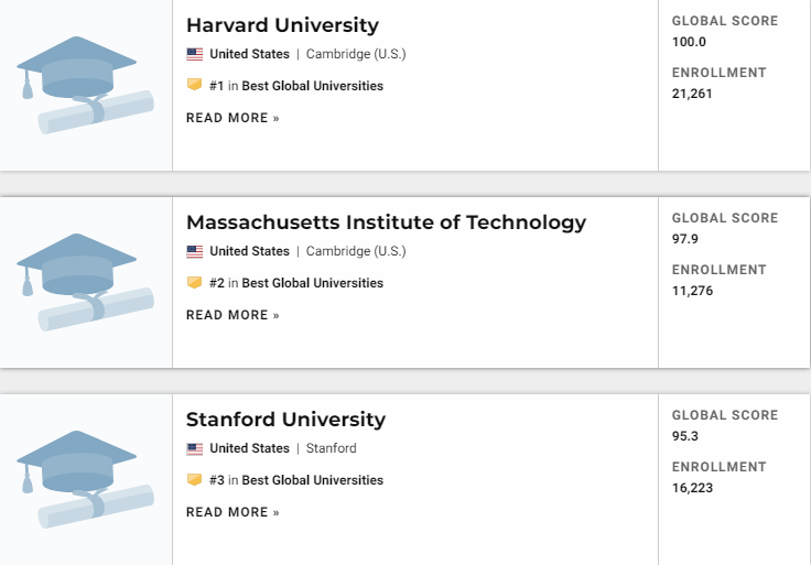10月19日,US News 发布最新的 2021 年全球最佳大学排名,哈佛大学、麻省理工学院、斯坦福大学成为此次排名的前三甲。