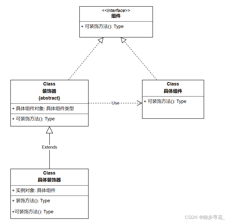 - 具体装饰器是装饰器的实现类,因此具体装饰器也持有具体组件,且可以实现可装饰方法。在具体装饰器中编写装饰方法。实现可装饰方法时组合调用具体组件提供的方法和自身的装饰方法,实现对可装饰方法的前置、后置装饰。