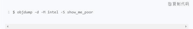然后,我们再通过gcc编译show_me_poor动态链接了lib.so的可执行文件。在这些操作都完成了之后,我们把show_me_poor这个文件通过objdump出来看一下。
