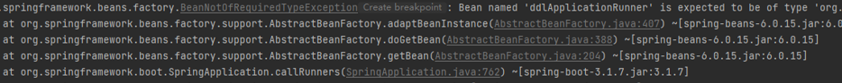 org.springframework.beans.factory.BeanNotOfRequiredTypeException: Bean named 'ddlApplicationRunner' is expected to be of type 'org.springframework.boot.Runner' but was actually of type 'org.springframework.beans.factory.support.NullBean'