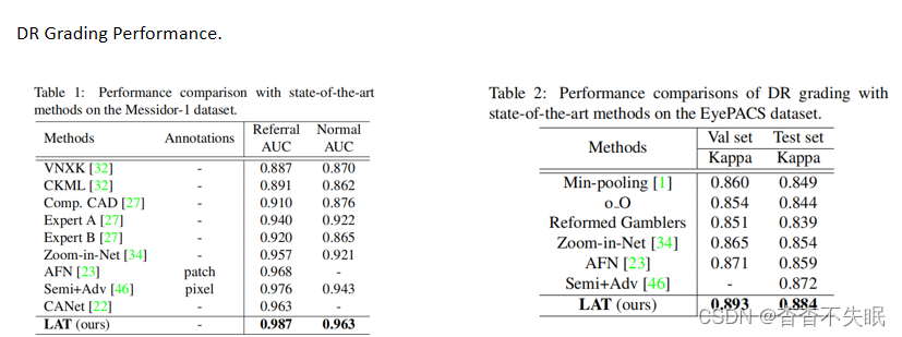 在Messidor-1、Messidor-2和EyePACS这三个数据集上进行的广泛实验结果表明,所提出的LAT优于最先进的DR分级和病变发现方法。