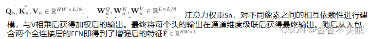 为了获得全局上下文信息,本文对像素关联进行建模,通过自注意力机制生成增强后的特征图。首先利用卷积层将特征图的通道维数减小到较小的维数L,然后将空间维数展平为一维,以产生新的特征图;然后根据特征图F获得对应的Q,K,V进行多头自注意力的计算