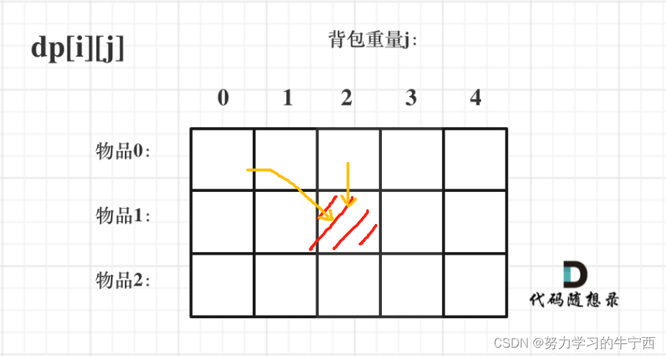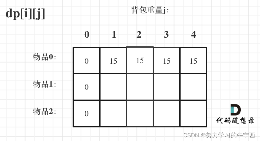- 那么很明显当 j < weight[0]的时候,dp[0][j] 应该是 0,因为背包容量比编号0的物品重量还小;