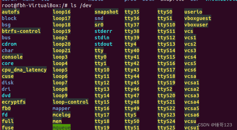 小提示:上面的黄色文字表示设备文件,浅蓝色文字表示链接文件,