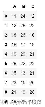 df = pd.DataFrame(data=np.random.randint(10,30,size=(10,3)),columns=['A','B','C'])