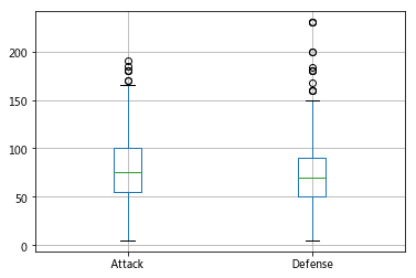 # 动手实践一下 data.boxplot(column=['Attack','Defense']) plt.show()