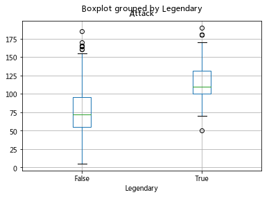 # 加入分类数据列‘Legendary’ data.boxplot(column='Attack',by='Legendary') plt.show()