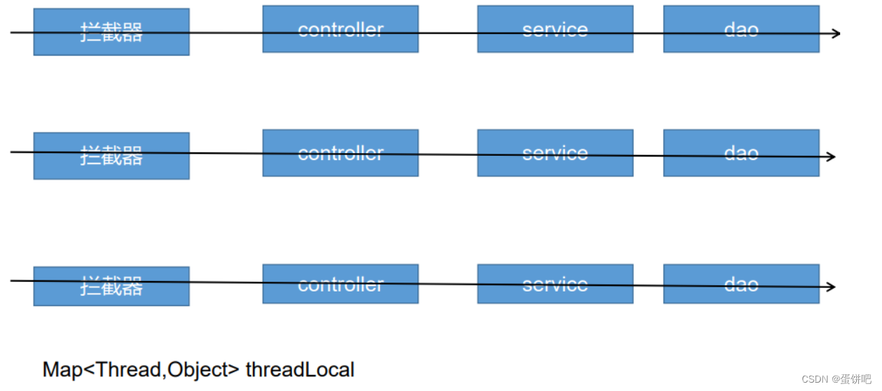 - 一次请求进来: 拦截器 ==>> Controller ==>> Service ==>> dao 用的都是同一个线程