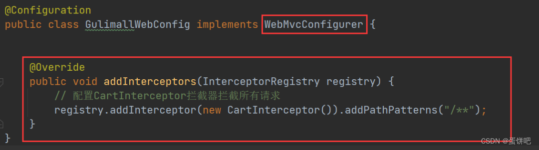 SpringMVC的拦截器机制,需要先编写一个类,实现HandlerInterceptor接口,根据业务需求重写接口中的方法。拦截器作用为在调用购物车的接口(实际上拦截器拦截所有请求,不只是购物车的请求)前,先通过 Session 信息判断是否登录,并分别进行用户身份信息的封装,并把