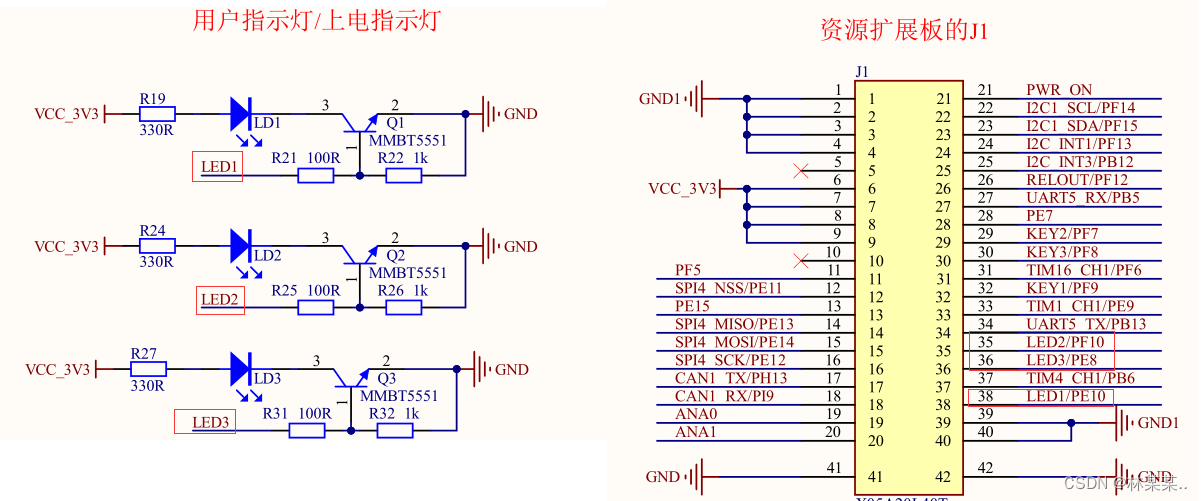 LED灯丝印为:LD1、LD2、LD3,通过查询电路图可知其对应引脚为:LD1->PE10、LD2->PF10、LD3->PE8