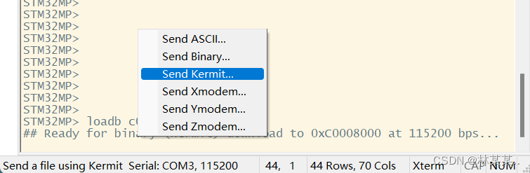 2.2 将.bin文件拖入串口工具窗口内,选取send Kermit