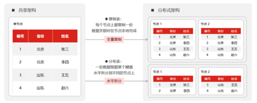 复制表是指每个节点上都复制一份数据,数据关联时在节点本地完成。分布表是指一份数据根据某个键值水平拆分到不同的节点上,将单个大表拆分成若干小表,提升系统读写的性能。