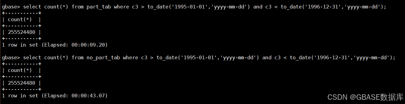 - 跨两个分区表查询只需要9秒,而普通表则需要43秒的时间。