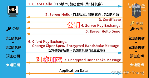 经历以上五步后,客户端和服务器端都既有公钥,又有私钥,然后都用公钥加密报文,用私钥进行解密,这样即使中途数据被黑客拿到了,也无法读懂报文的内容