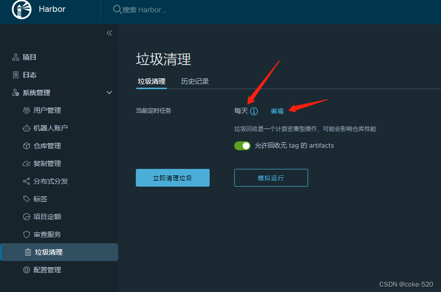 2、在harbor仓库里面系统管理-垃圾清理配置下定时清理规则