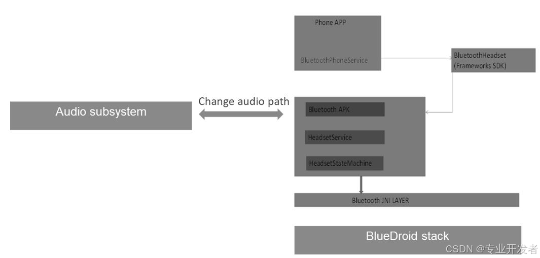 图 展示了模块间的交互(包含 Phone APP、Bluetooth Host、Bluetooth JNI、Audio subsystem、BlueDroid stack 等模块)。