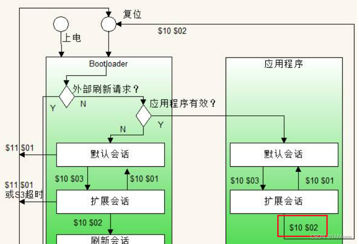 最近在做刷写相关的测试,此篇内容的灵感来源于我对编程会话的好奇,一直以来我都对APP和Bootloader的认知都不太清晰,网上的资料都比较抽象没能理解(也可能是我自己的问题)。比如APP中有01,02,03三种会话模式,Bootlaoder中也有三种,那他们的异同是什么呢?曾经我认为APP和BOOT是相互独立的,他们属于两个平行世界,但随着深入的了解,我发现好像不是这样,02编程会话就是他们之间的虫洞,但如果APP的$1002是进入BOOT,那BOOT的$1002又是干什么的呢?这个问题困扰了我很久,直到我看到下面这张图: