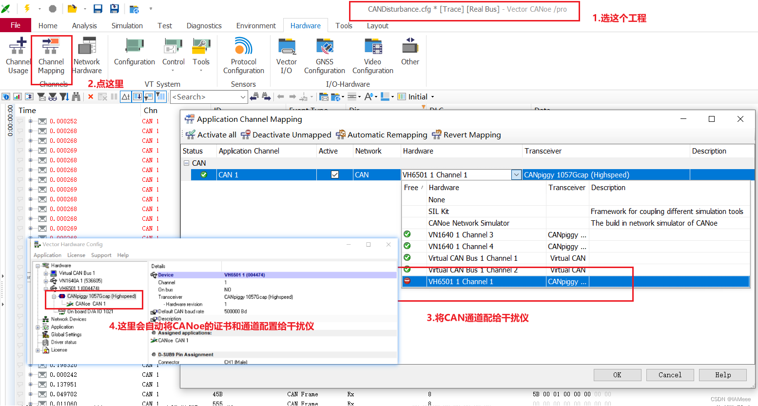 1.硬件通道的配置,以及测试工程的选择,测试工程一般选择CANoe自带的例子。