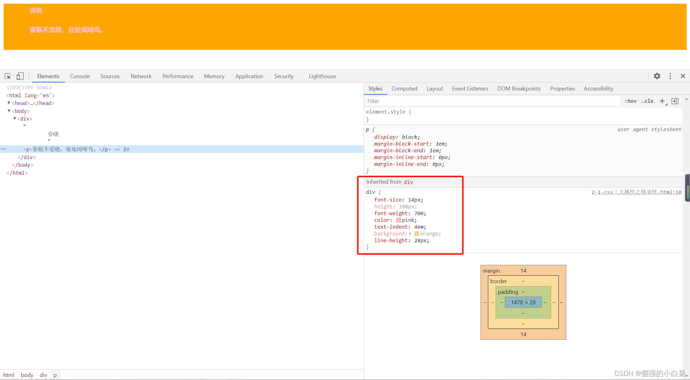 /* 子元素可以继承父元素的样式(text- ,font-,line-这些元素开头的可以继承,以及color属性)。口诀:龙生龙 凤生凤 老鼠的孩子会打洞。继承可以简化代码,降低css样式的复杂性 */