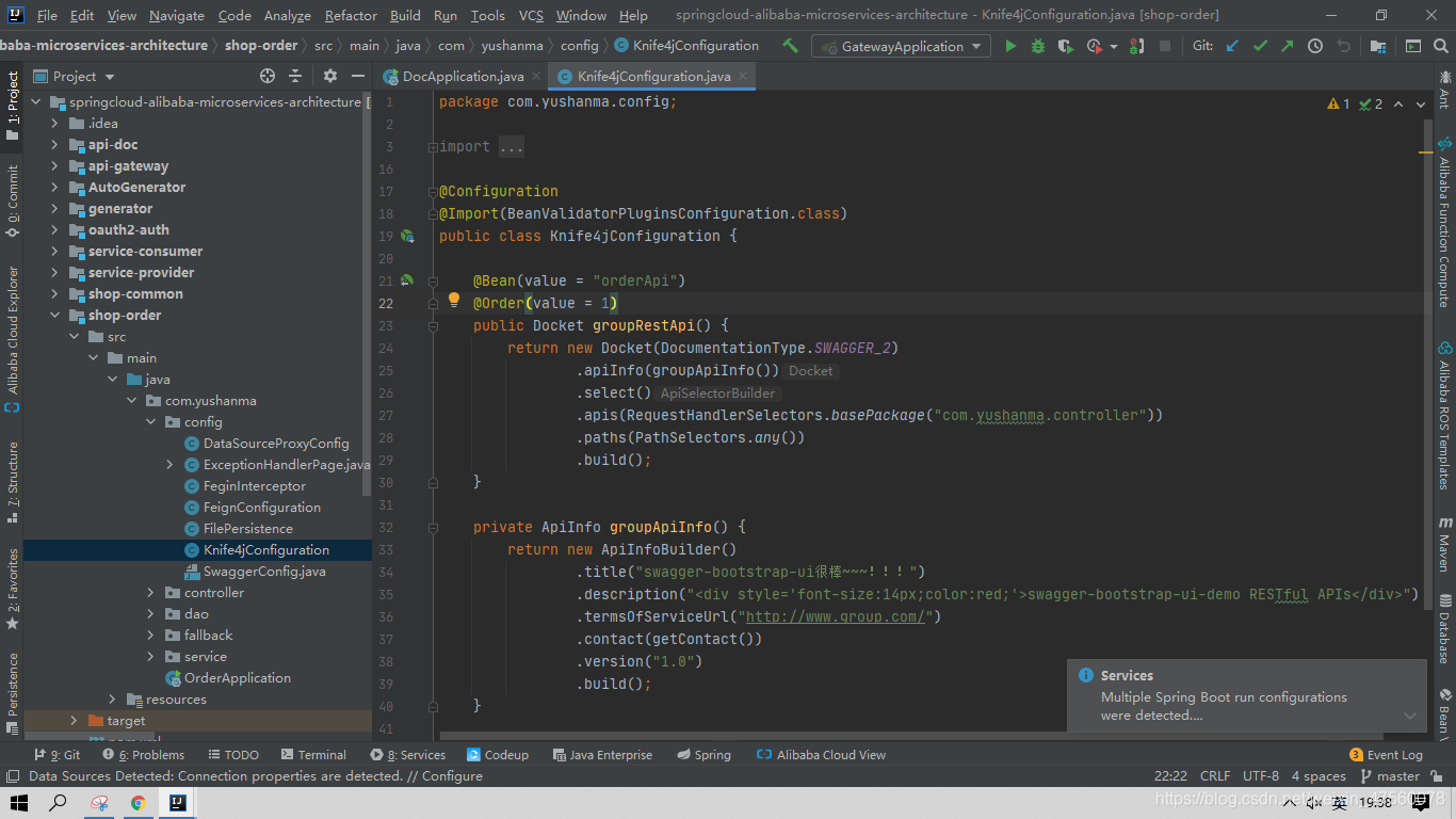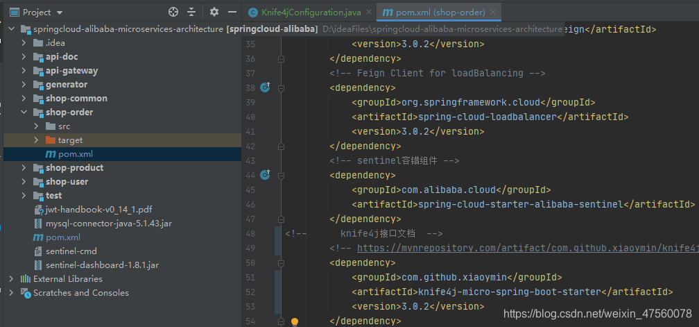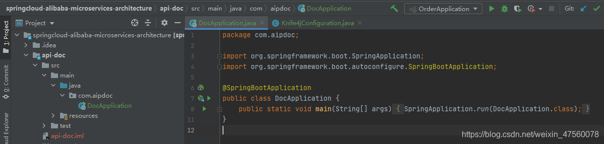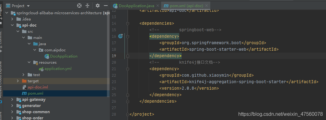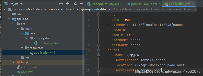 至此,api-doc模块已经配置好了。如果有gateway网关,要放行api路径,在官方文档中有指引,这里只是做一个简单示例。接下来是在各个微服务模块中配置knife4j。