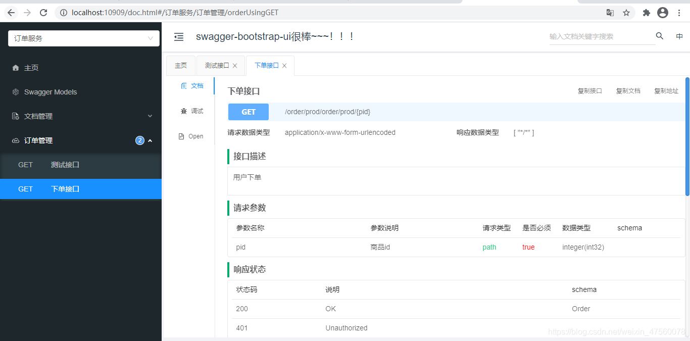先启动其他微服务,最后启动api-doc微服务,访问文档中心 http://localhost:10909/doc.html#/home,我们就可以看到编写好的接口,以及进行在线调试接口