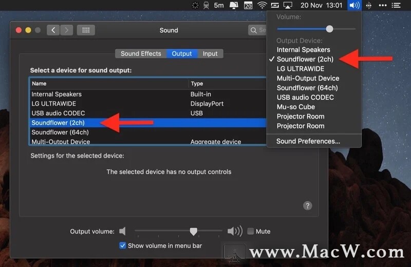 9.单击菜单栏中的音量图标,然后选择Soundflower(2ch)。您也可以在“声音系统首选项”窗格中进行选择。