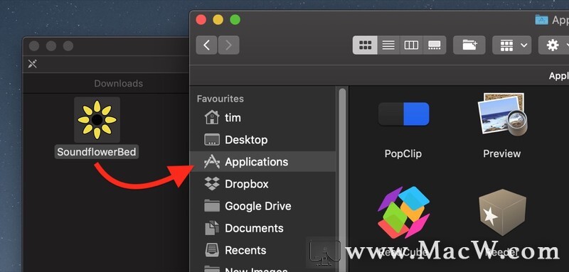 6.接下来,下载SoundflowerBed实用程序(v2.0),挂载.dmg文件,并将花朵图标拖到Applications文件夹中。