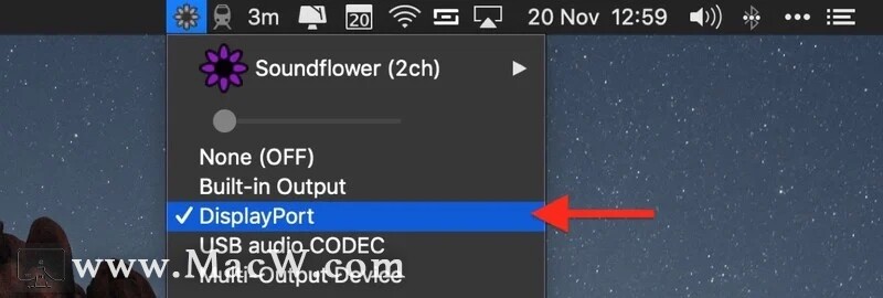 8.单击菜单栏中的SoundflowerBed图标,然后在(2ch)列表中选择DisplayPort,Thunderbolt或HDMI作为输出。