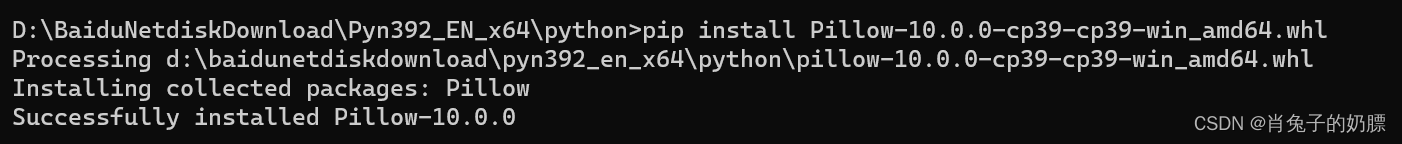 然后直接输入pip install Pillow-10.0.0-cp39-cp39-win_amd64.whl ,最后显示successflly代表安装成功。