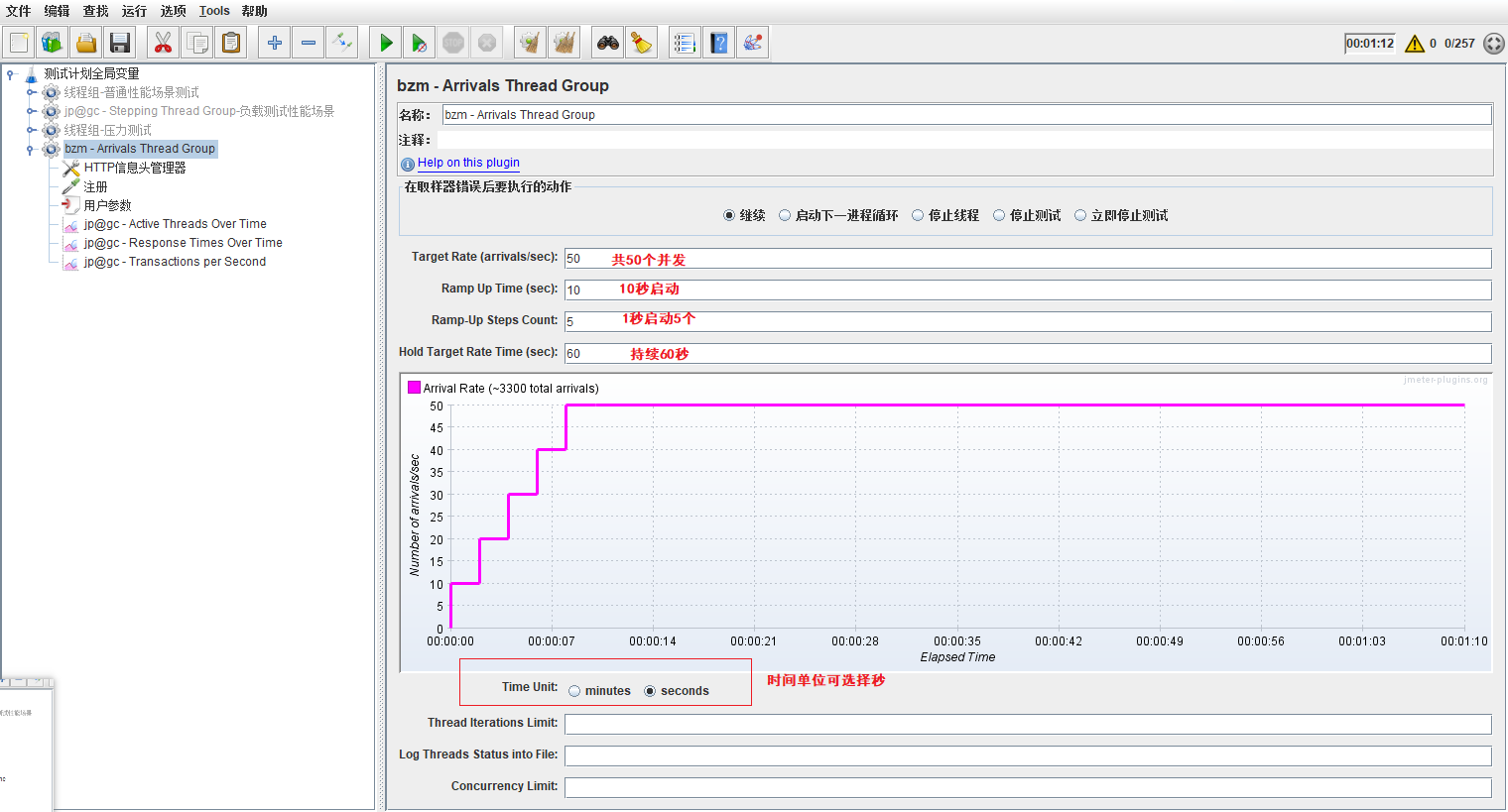 jmeter秒杀活动接口场景设计 jp@gc - Active Threads Over Time(10秒内启动到50并发,并持续60s)jp@gc - Response Times Over Time( 50并发的平均响应时间在2.5s左右)得出结论:并发在50左右时,响应时间2.5s,tps值为20左右,得出结论,接口不支持50并发。jp@gc - Transactions per Second(tps并发数在20左右)需求:性能系统较差,设置目标需求为50并发。