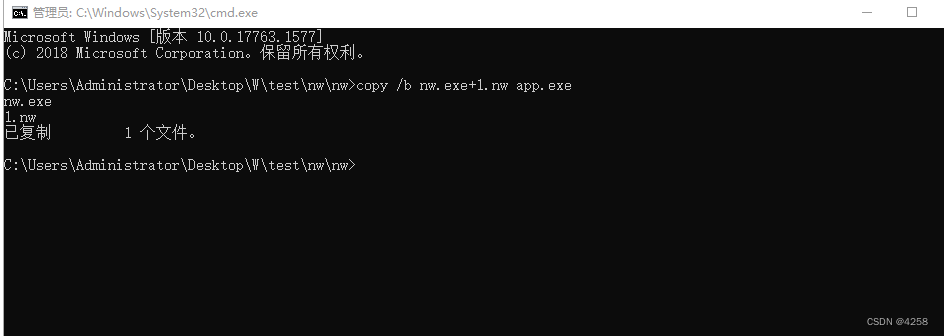 6. 从nw文件夹进入cmd, 执行命令 copy /b nw.exe+1.nw app.exe