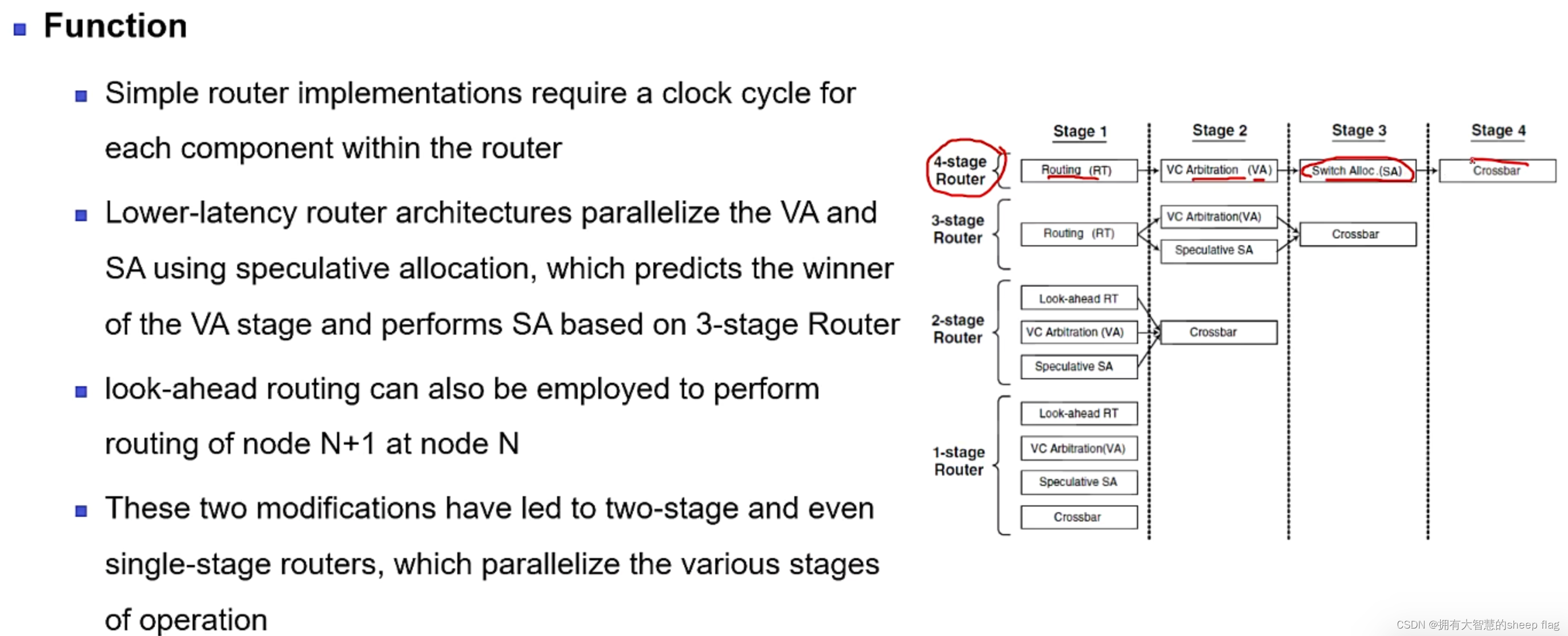 - cut-through:每个flit一到达就可以进入下个channel,pipeline的形式。低延迟传输效率较高。