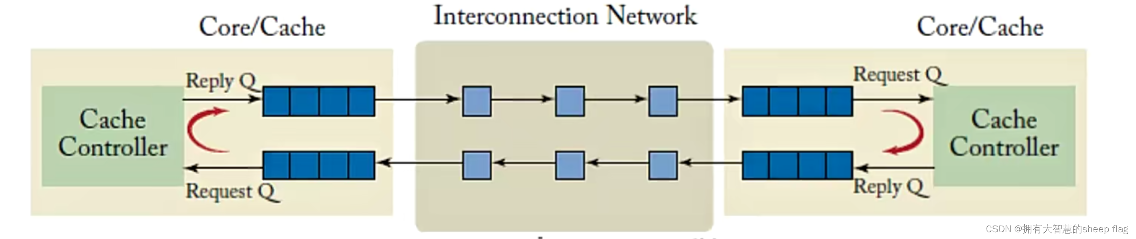 - broadcast:一致性请求会发往所有的片上节点,从而导致高带宽要求,数据响应是点对点通信,对响应顺序没有要求。两套物理网络可以实现:有序的互联网络和高带宽无序网络。