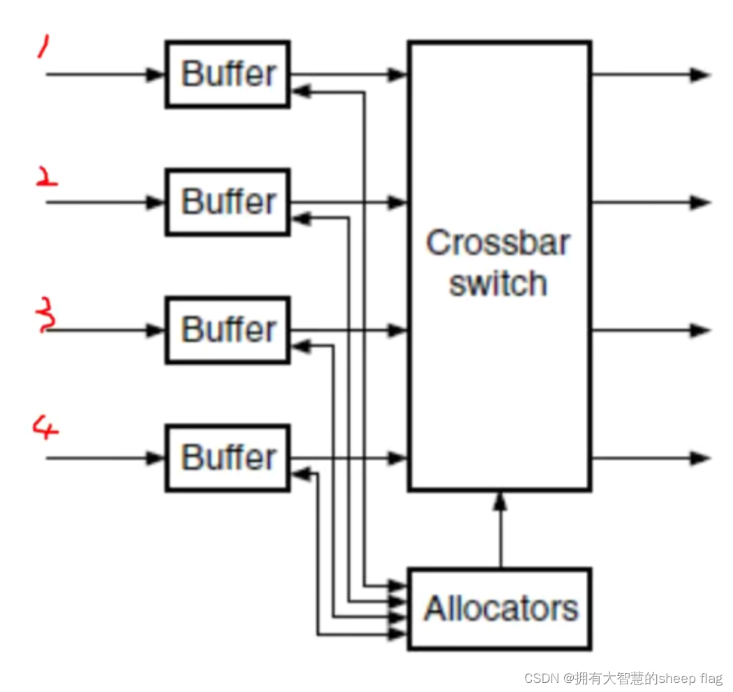 每个输入通道都会与buffer连接,保存到达的flit,直到它们离开所需资源,交叉开关可以被配置为连接输入缓冲区和任何离开的通道,通过allo与buffer之间的通信机对crossbar的控制进行传输。