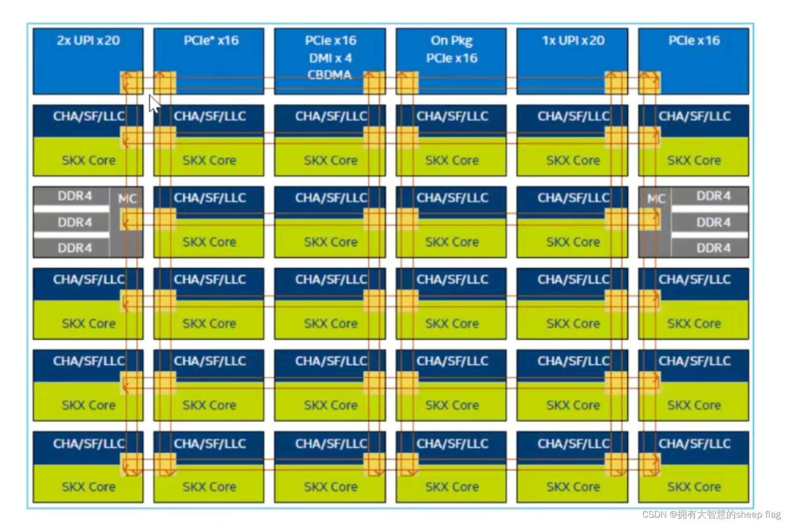 图为skylake28核互联,用的是mesh的结构。因此总线在多核网络中起了至关重要的作用。